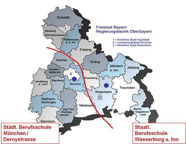 Technische Produktdesigner (einschl. TSP) im Regierungsbezirk Oberbayern werden an den Schulstandorten Berufliches Schulzentrum Wasserburg am Inn und Städtische Berufsschule München / Deroystrasse unterrichtet. Ausschlaggebend ist der Sitz des Ausbildungsbetriebes.